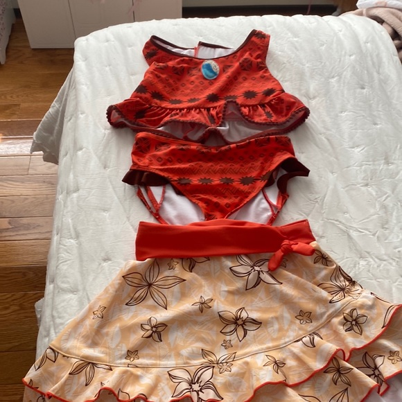 Great used condition bikini top with bottom Moana themed with matching skirt. Bought at Disney Polynesian resort.