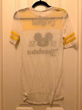 Authentic Disney Parks Original Mouseketeer T-Shirt featuring a vintage-inspired 1955 graphic. This sporty jersey-style SHEER top includes yellow panels on the yolk and double stripes on the sleeves. Perfect for a day at Disneyland or Disney World! Good pre-owned condition with some gentle wear consistent with use. You do need to wear a tank under this shirt.