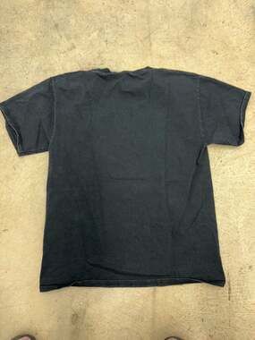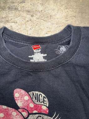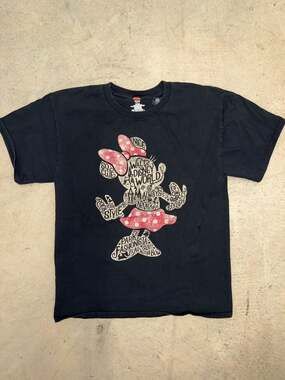 Vintage Disney Minnie Mouse Graphic T-Shirt, size Medium, in black. This t-shirt features a large Minnie Mouse silhouette graphic on the front with a word cloud design inside. Made from 100% preshrunk cotton on a Hanes Tagless blank. Good pre-owned condition with some light fading consistent with age. No major holes or stains. Perfect for a day at the parks or casual everyday wear.