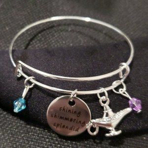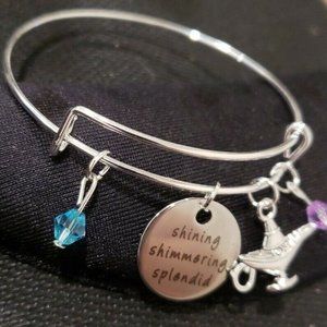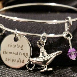 * Show everyone your love for ALADDIN PRINCESS JASMINE with this beautiful handmade charm bracelet. Inspired by the Disney movie ALADDIN PRINCESS JASMINE, this little beauty features an approximately 1" round 20 gauge nickel disc with the quote "Shining, shimmering, splendid", coupled with Tibetan silver genie lamp charm. Additionally there are two sparkling accent charms. Bracelet is stainless steel, adjustable, and will fit most wrists from 6 - 9 inches. The perfect gift for any ALADDIN PRINCESS JASMINE fan!