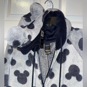 Cozy and fuzzy pajama onesie with Mickey Mouse design. The hood has ears as pictured above, never worn! The color is light blue and the Mickey pattern is dark blue. make me an offer :)