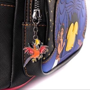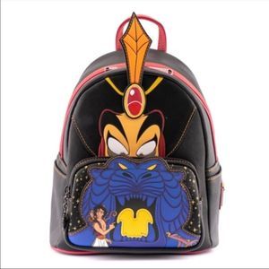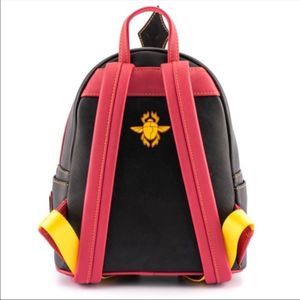 You won't need to summon Genie to add this stylish Loungefly mini backpack to your wardrobe! Inspired by Aladdin, the iconic Disney Villain, Jafar, decorates the top canvas of this bag, looking down on die-cut details on the front pocket design of Aladdin, Abu, and Flying Carpet entering the Cave of Wonders. With an enamel zipper pull of Iago, a die-cut appliqué of Jafar's headdress gemstone and feather on the top, adjustable shoulder straps, an enamel brand badge, and an interior lining pattern of a sinister looking Jafar, you can enjoy a whole new look for your adventures with this backpack.