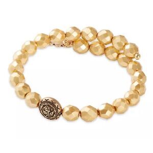 Celebrate Belle, princess-to-be, with this gold glass pearl bead wrap bracelet spotlighting a brass Enchanted Rose symbol centerpiece, plus (+) Energy and Mickey Mouse icon charms in a goldtone finish.