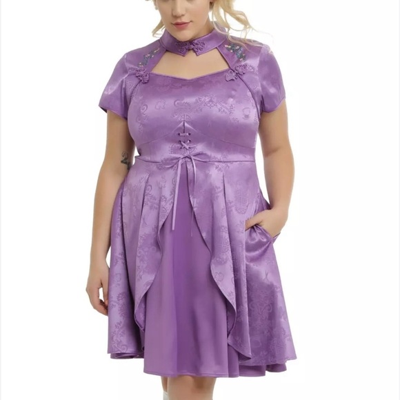 Purple satin dress from the limited edition Hot Topic Alice Through The Looking Glass collection inspired by Colleen Atwood's gorgeous costuming. Intricate brocade detailing with Wonderland symbols and vibrant embroidery around the collar puts a fresh new twist on the classic fit and flare body. Sweetheart neckline. Lace-up detailing on the front. Back zipper closure.