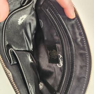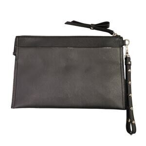 Features: Zip close, studded wrist strap, One zip and 2 open pockets inside, detachable strap.