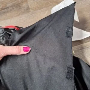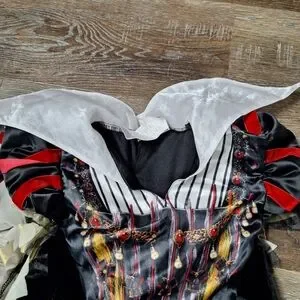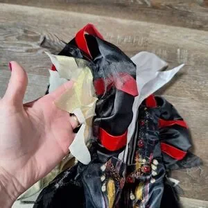 "Rule the land in style with this officially licensed Red Queen Costume! Featuring the Red Queens signature look from Alice Through The Looking Glass. This costume is perfect for any sassy queen!" A super fun costume with hearts, tulle, crocheted edging on the skirt, puffy sleeves that have velour stripes, small v-neckline with exaggerated white collar! Perfect for parties, theatre plays, Halloween, or just for fun! Preloved--I see only one issue, the Velcro got caught in 1 spot on the back-please see photo-the rest is in excellent condition. (Does not come with shoes or tights shown in primary photo)