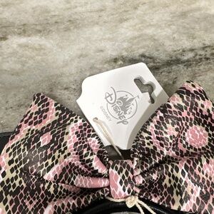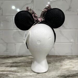 For Sale is a Brand New with Tags Disney Parks Minnie Mouse Faux Leather Ears Headband. These were made exclusively for the Disney Parks and the Animal Kingdom Park by Loungefly. It features padded faux leather ears embossed with Mickey Mouse head and a pink snakeskin faux leather bow. The matching faux leather headband has a non-slip velour interior. Comes from a Smoke Free and Pet Free Home.