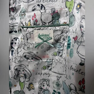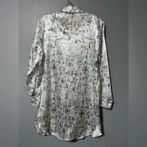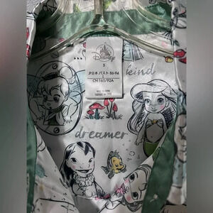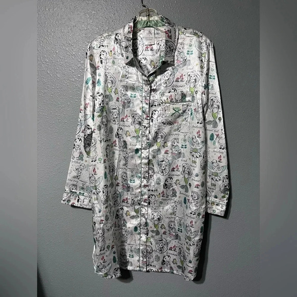 Disney Animators Collection Nightshirt Night Gown Sleepwear Womens Sz Small EUC. 100% polyester. Button front. Chest pocket with bow accent. Long sleeve silky satin feel. Measurement from shoulder to hem 36 inches. Wrist to shoulder seam 23.5 inches. Armpit to armpit laying flat 21.5 inches.