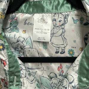 Disney Animators Collection sleep shirt featuring an all-over print of beloved princess characters including Belle, Ariel, Pocahontas, and Tinker Bell. This satin-finish sleep shirt is designed in a button-down style with a notched collar and long sleeves.