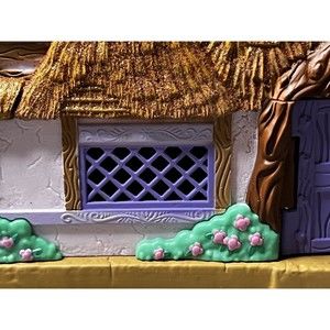 Listing is for a preowned item in great condition, includes aurora, the fairies, the cottage which opens from back, front door swings opens, the dress spins around, auroras bed, the table and cake and a squirrel