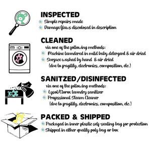surface cleaned by hand & steam sanitized (due to age, electronics, composition, etc.)