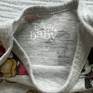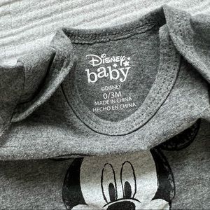 (1) gray short-sleeve pants romper with crotch snaps featuring a screen printed Mickey and kangaroo-pouch pocket (worn maybe one or two times but has a small snag / rip on one sleeve, as shown in picture)
