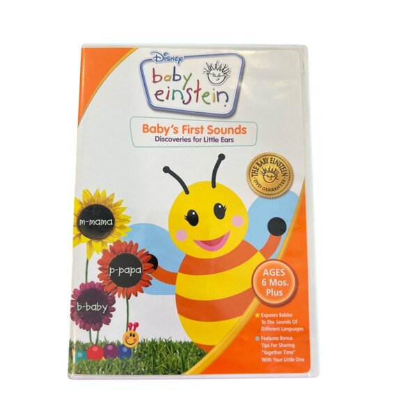 Disney Baby Einstein Baby's First Sounds DVD exposes infants to basic sounds like “ma-ma” and “da-da" while integrating languages such as English, Spanish, and French. This 33-minute digital board book includes engaging visuals, puppet shows, and classical music to help enhance language and sensory development. Pre-owned.