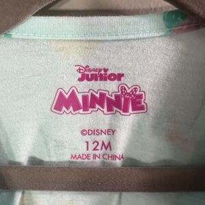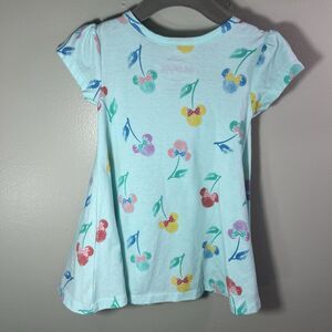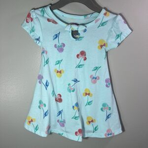 This Disney Girls Dress in size 12 months is a light blue color with a Minnie Mouse cherry pattern, perfect for a casual occasion. Made from a blended fabric of polyester and spandex, the dress features a round neck, short cap sleeves, and a pullover closure. The knee-length fit & flare style dress also includes a cute bow accent, making it a fun and playful choice for the summer and spring seasons. Made by Disney, this dress showcases the beloved Minnie Mouse character, ideal for any young girl who loves cartoons and novelty items.