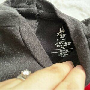 Details: Cuddle up with your cutie and this Mickey Mouse Costume Bodysuit. Complete this with ear beanie cap, embroidered character details, and mittens, your baby will quickly transform into everyone's favorite little mouse. Authentic Disney Baby Costume Bodysuit. Bodysuit features embroidered Mickey Mouse gloves on sleeves. Three snaps at bottom, Snaps on shoulders as well. Inseam snaps.