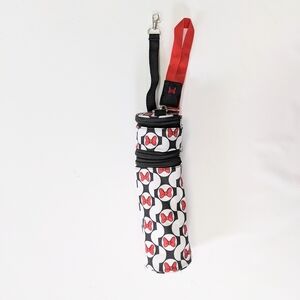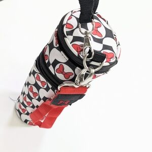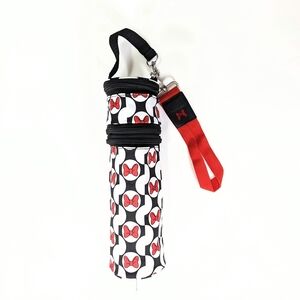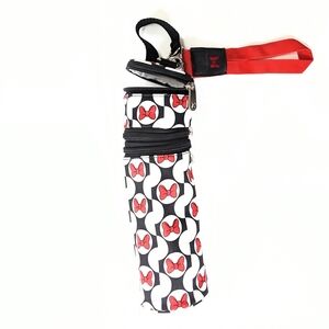 Charming 3 compartment black, red & white bottle holder with Minnie Mouse bow design. Features a convenient handle and strap for stroller and hand carry. Silver hardware closure with Minnie Ear design. Perfect for Disney fans. 100% Polyester. Excellent condition! Never Used!