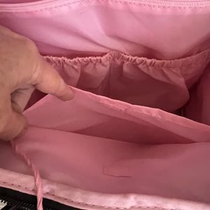 14 Roomy Pockets 1 insulated side pocket, other side pocket has a hook and loop smaller pocket attached to it front pocket has 2 slip pockets and zippered mesh pocket inside has 2 slip pockets, 1 zipper pocket and 1 hook and loop pocket back has large hook & loop pocket wet pouch (missing diaper pad) adjustable straps and adjustable stroller loops measures 16" L x 13.25" W x 6" D