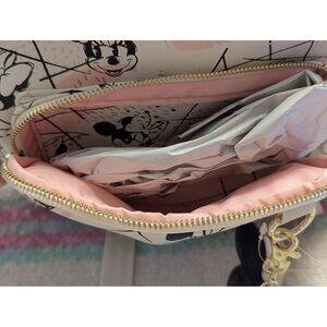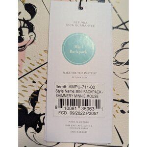 This mini backpack combines charm and functionality, featuring a Minnie Mouse design in white, pink, and gold accents. Crafted by Petunia Pickle Bottom, it includes a matching leather Minnie keychain and durable straps for easy carrying. Ideal for carrying essentials while maintaining a fashionable look.