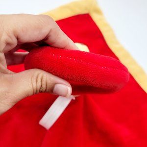 This Disney Baby piece is from the classic children's cartoon, Winnie the Pooh. This is a soft, plush, red and yellow, Winnie the Pooh bear, lovey or security blanket toy with a plush, 3D Pooh bear, circle rattle on the top of a square blanket. An adorable lovey for your little!