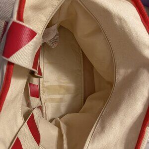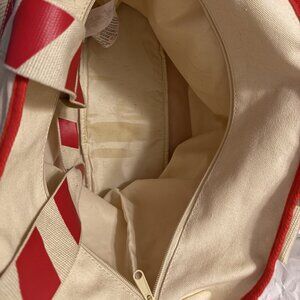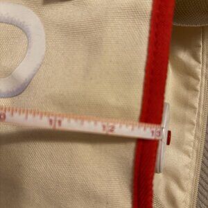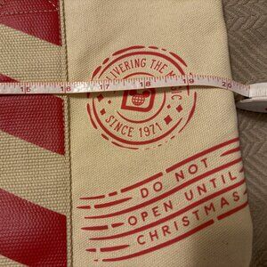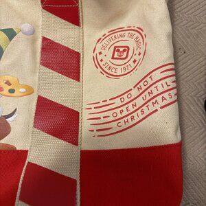 Yes, it's a Christmas bag, but not too soon to think about it. Grab this hefty carry-all to use now or stash away for the holidays. Outside has cute characters enjoying the season. Sturdy handles and a roomy inside pocket. Thirteen inches deep and 20 inches wide.