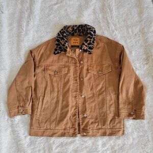 Design by Ouyang NANA. This stylish jacket blends rugged denim with a chic leopard collar, offering warmth with its quilted lining. A unique Bambi print adorns the back.