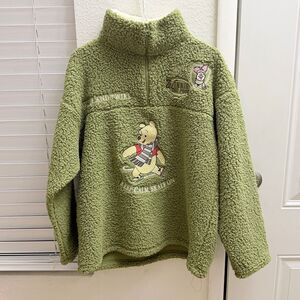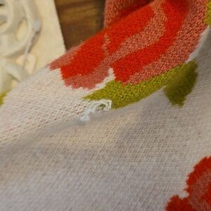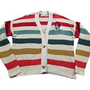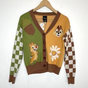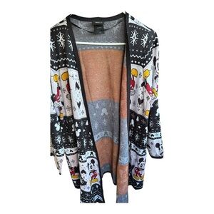 Vibrant Disney Beauty and the Beast cardigan with red roses and green accents. Features characters and Belle patch. Has stretch and pockets. Runs large. Pull on sleeve but good overall condition