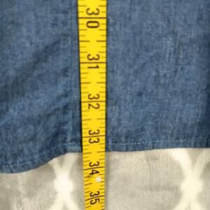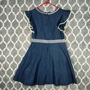 Details: Scoop neckline with decorative front buttons, flutter sleeves with lace edging, lace waistband detail, back zipper and top button closure, unlined, lightweight woven denim fabric.