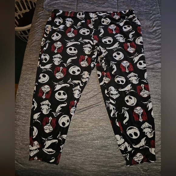Stretchy Disney leggings with all-over Halloween character motifs. Bold white faces and red hair accents on a black base. Comfortable fit for everyday wear. Easy to pair with casual tops.