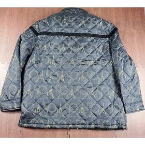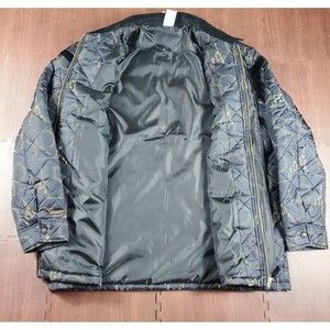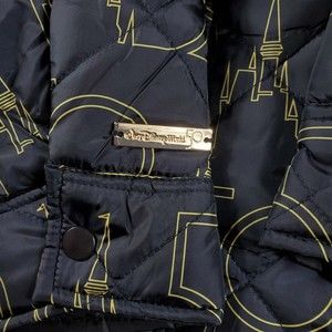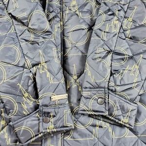 Chic Disney puffer jacket with bold design. Features black and gold accents. Perfect for casual outings.