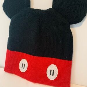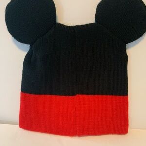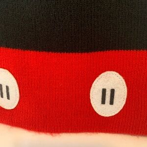 Cute black and red beanie with Mickey Mouse ears. Features playful design with button details.