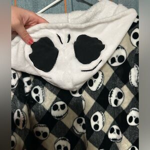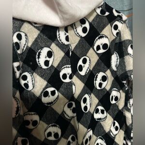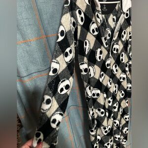 Cozy Disney onesie with Nightmare Before Christmas pattern. Features hood and long sleeves. Perfect for lounging.