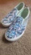 Fun Disney sneakers with blue Stitch character print and shiny silver sides. Easy slip-on style for playful adventures.