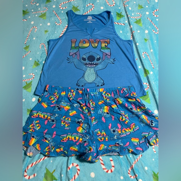 Blue pajama set featuring Stitch with colorful accents. Perfect for cozy nights. Pride collection