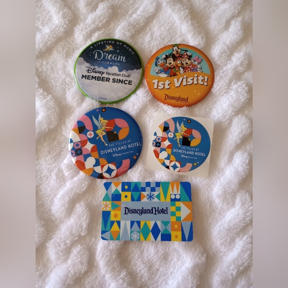 DVC, Disneyland Park, and Disneyland Hotel pin, Disneyland Key card and sticker.
