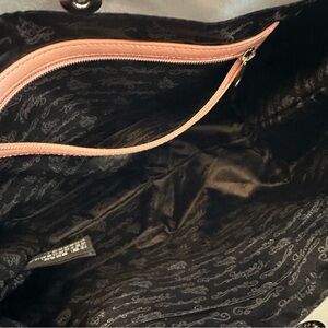 Elegant Disney satchel with playful character design. Features pink handles and intricate black lace accents.