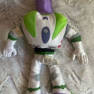 Soft Buzz Lightyear plush from Disney. Features bright green, white, and purple colors. Perfect for play and cuddles.