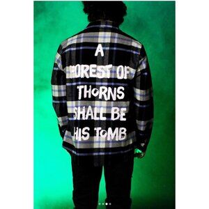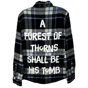 "A Forest Of Thorns Shall Be His Tomb" on the back