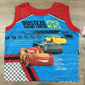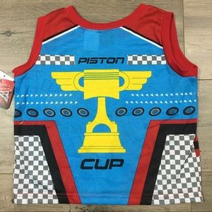 New with tags. Has Lightning McQueen, Cruz Ramirez, and Jackson Storm on the front shirt. Shorts are black with blue stripes.