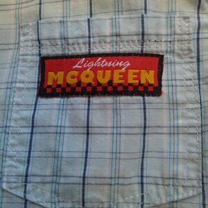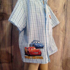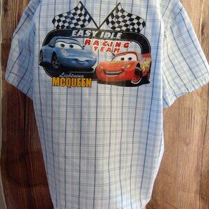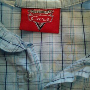 DISNEY CARS BLUE CHECKERED BUTTON-UP SHORT SLEEVE SHIRT: Fun and comfortable.