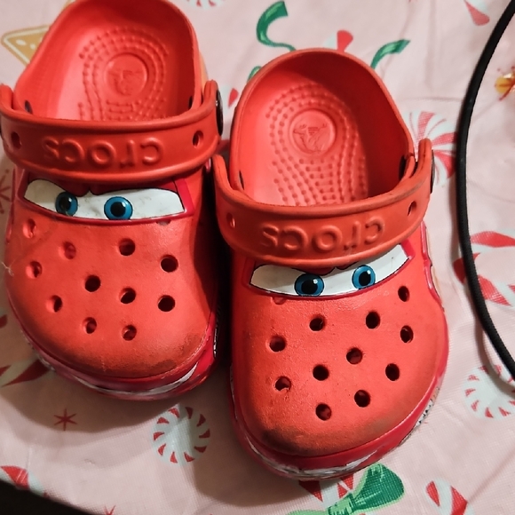 Disney cars Lightening McQueen crocs. Left strap is broken. They light up. **SEE PHOTOS FOR IMPERFECTIONS**