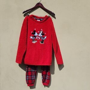 Soft red fleece top with playful character design. Matching plaid pants for cozy nights.pit2pit 19" waist 12"