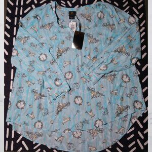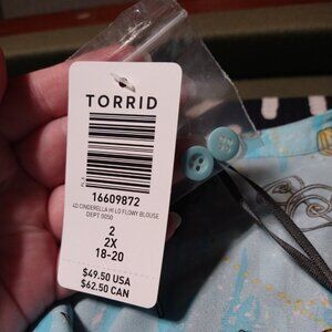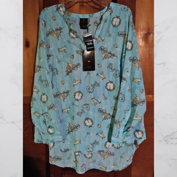 Light blue blouse with a print of Cinderella themed icons. Disney Princess x Torrid collection. Hi-Lo cut and split neckline. Made of Torrid's "Georgette woven fabric: Long-lasting, breathable, slightly sheer and super low-maintenance." 100% polyester. Women's size 2X. New with tags including extra buttons, only taken out of the bag for pictures. Pet friendly household.