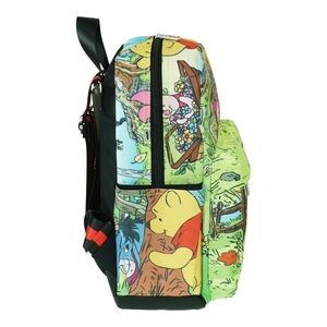 Discover the magic of the Hundred Acre Wood with Disney Winnie the Pooh Backpack! Featuring an oversized print of Pooh and friends in vibrant, captivating colors, this backpack brings the beloved characters to life in a cavas look-alike print. Pooh holding flowers with Piglet, alongside Eeyore and Tigger, adorn the side pockets, while the adjustable soft straps ensure comfort and durability.