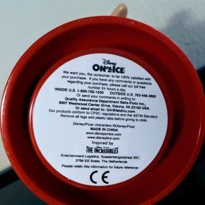Disney on Ice, Super hero "Dash", collectible souvenir plastic flip-top mug. Good condition, gently used, minor tiny marks. One on the left side of the flip-top, and the other on the left behind the ear. So small may not be seen in the photos.