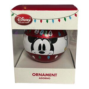 Add a touch of Disney magic to your holiday décor with this 2014 Disney Collection ornament. Featuring Mickey Mouse, Donald Duck, Goofy, and Pluto against a shiny red background with colorful holiday light designs, this round ball ornament makes a cheerful addition to any Christmas tree. Comes in its original box, perfect for collectors, display, or gifting.