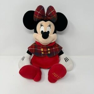Disney Collection Minnie Mouse plush wearing red boots, red skirt and plaid red and green yellow white and blue cape and bow. Embroidered gold tone buttons on her shoes and cape. 2015 embroidered in gold on the bottom of her left foot.