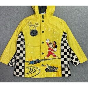 Adorable Disney Collection Mickey Mouse rain jacket in vibrant yellow with black-and-white checkered accents. Features Mickey in a race car design with #28 speedometer detail. Waterproof vinyl shell with soft inner lining and snap button front.