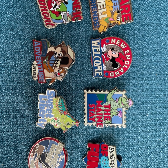 Set of Disney-themed pins. Features vibrant designs. Perfect for collectors.