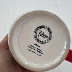 Disney Store mug for coffee or tea. White with red handle, dark blue interior and classic Mickey Mouse. Reads Copenhagen across the bottom, sold at Disney Stores in Copenhagen, Denmark - not available in the USA