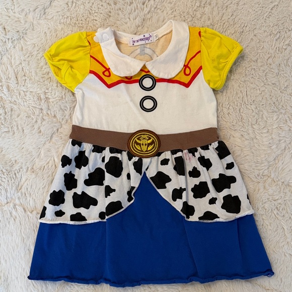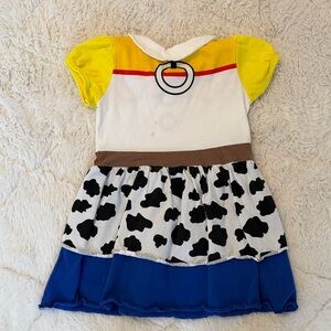 Adorable Disney cowgirl outfit. Features yellow sleeves and blue skirt. Fun cow print details. Perfect for Halloween. No size but my daughter was 2 years old when she wore it.